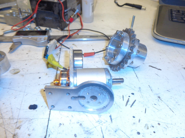 c'est un petit moteur brushless de drone qui fait tourner un reducteur a train epicycloidal de 1/250 la réduction est dans le barbotin un roulement enmanché sur le réducteur vient renforcer la rigidité du montage.