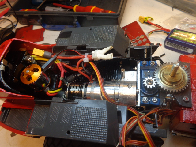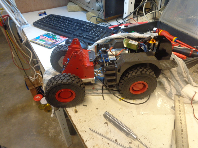 a l'avant j ai mis un servo pour le blocage du dif et le distributeur il faut que je finisse le montage de l hydraulique et que j'organise les composant dans le compartiment arrière. ça devrai rentrer. je me demande si je ne devrais pas acheter une autre radio plus moderne? mais quoi une I10 TURNIGY ça aurait été bien mais c'est intouvable la premiere je l avait acheter 85€ si j avais su c'est une palette que j'aurai acheté.