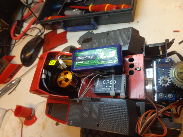 Et voici la touche final j ai rangé tout les éléments sous le capot. puis fait une plaque en epoxy pour l'installation du récepteur et de l'accu.