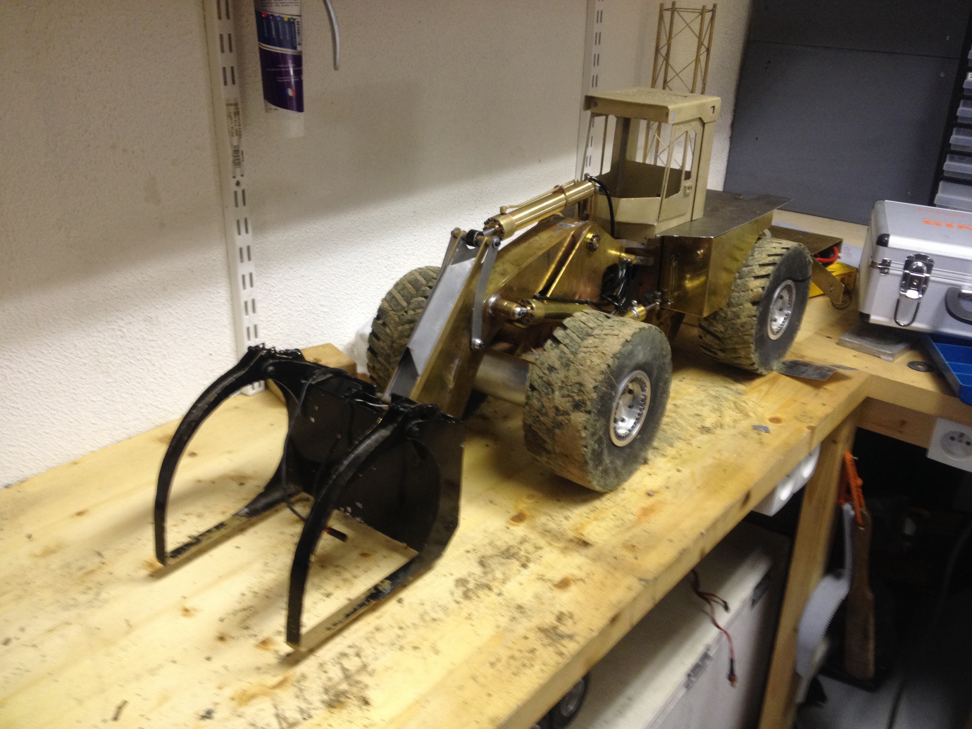 Alors suite a l expo de bourg j ai fait une petite modif car je me suis aperçu que mon vérins de godet était trop cour de 15mm du coup je pouvais pas vider si le bras avais pas une certaine hauteur du coup refait le fut et c est bien mieux ! (:o)
