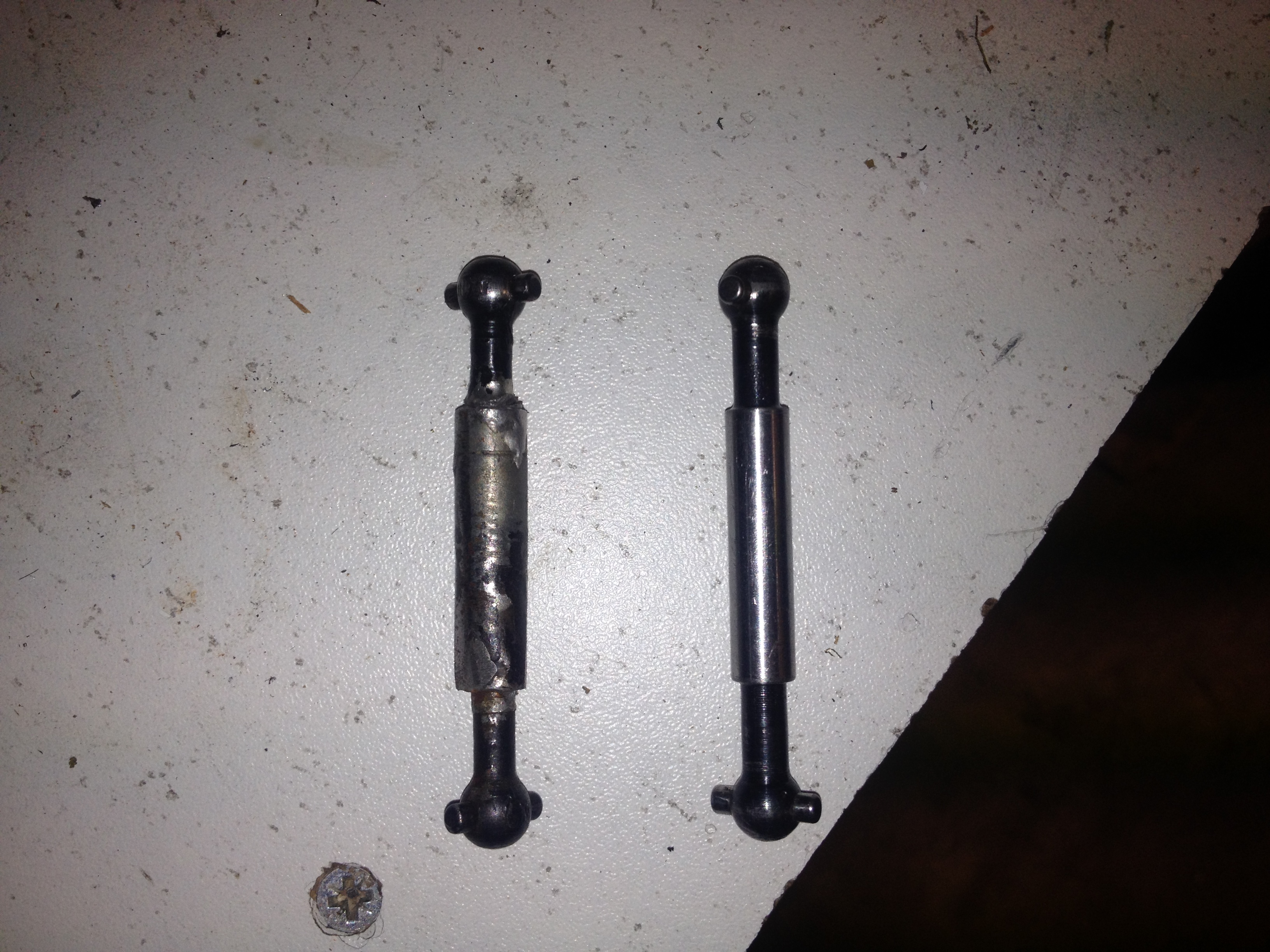 l ancien a gauche le truc tout mal fait et oui a l époque j avais pas de tour a droite le neuf fait au tour a partir d un bout de tige de 7mm acier percer a 5mm puis mes deux bout de cardant coller blockpress