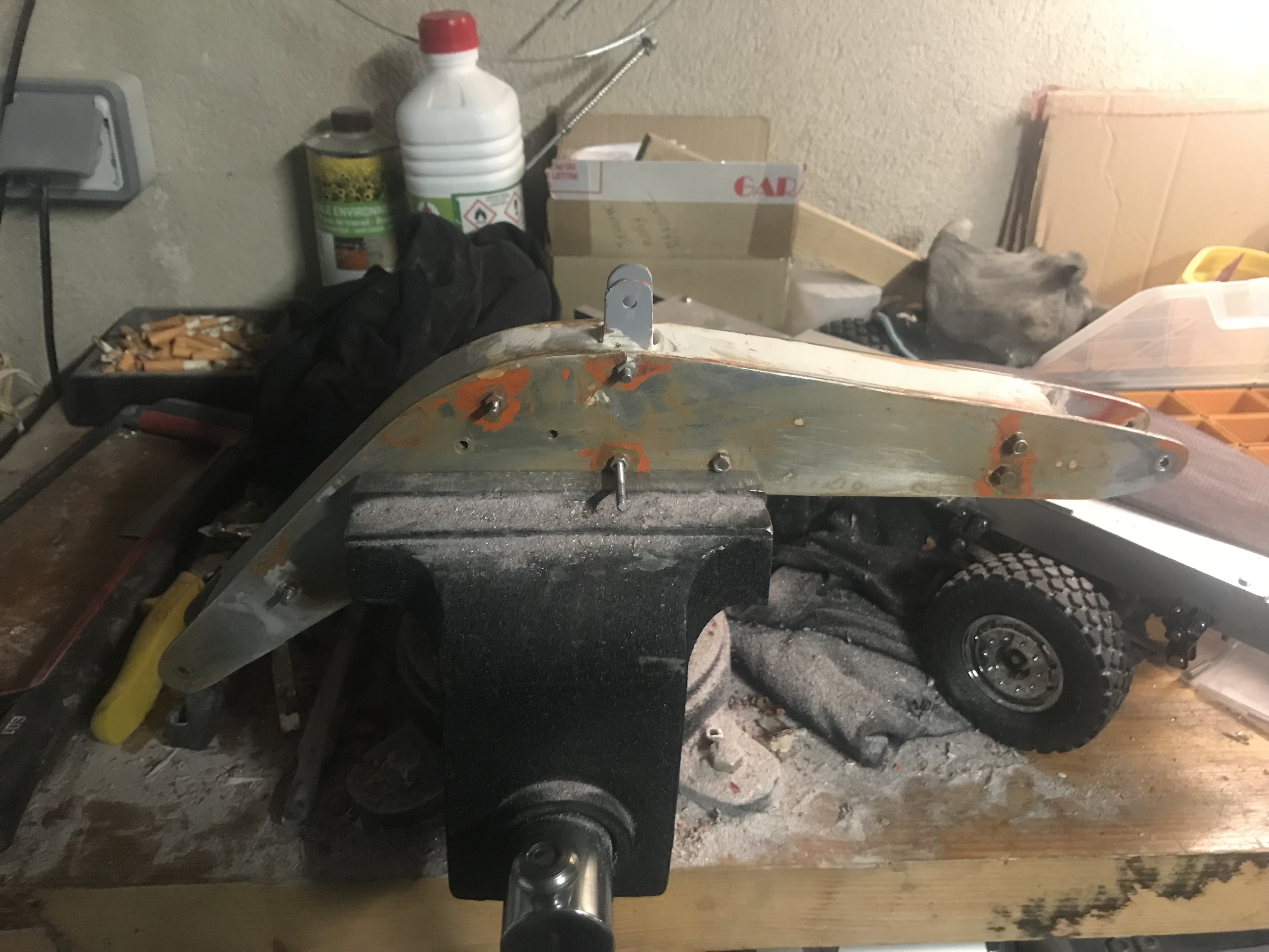 Il faut que je lui mette du poids à l'arrière car avec un godet Huina en metal sans stab sa bascule lol !
