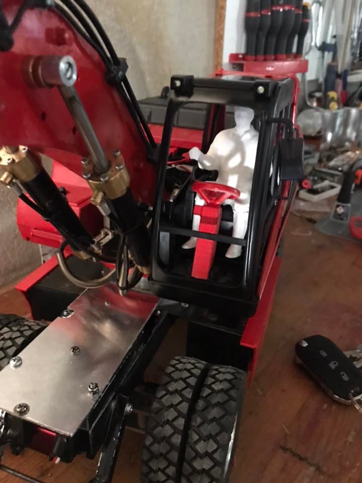 elle est en 4x2 avec des trains réalisés sur mesure (pas par moi), cabine bruder, bras alu, hydro magom. la pelle n'est pas finie à ce jour, il me reste encore un stab a mettre, des attentes auxiliaires élec (2). au début je lui avais fait une lame a l'avant mais je l'ai remplacé par un stabilisateur CTI