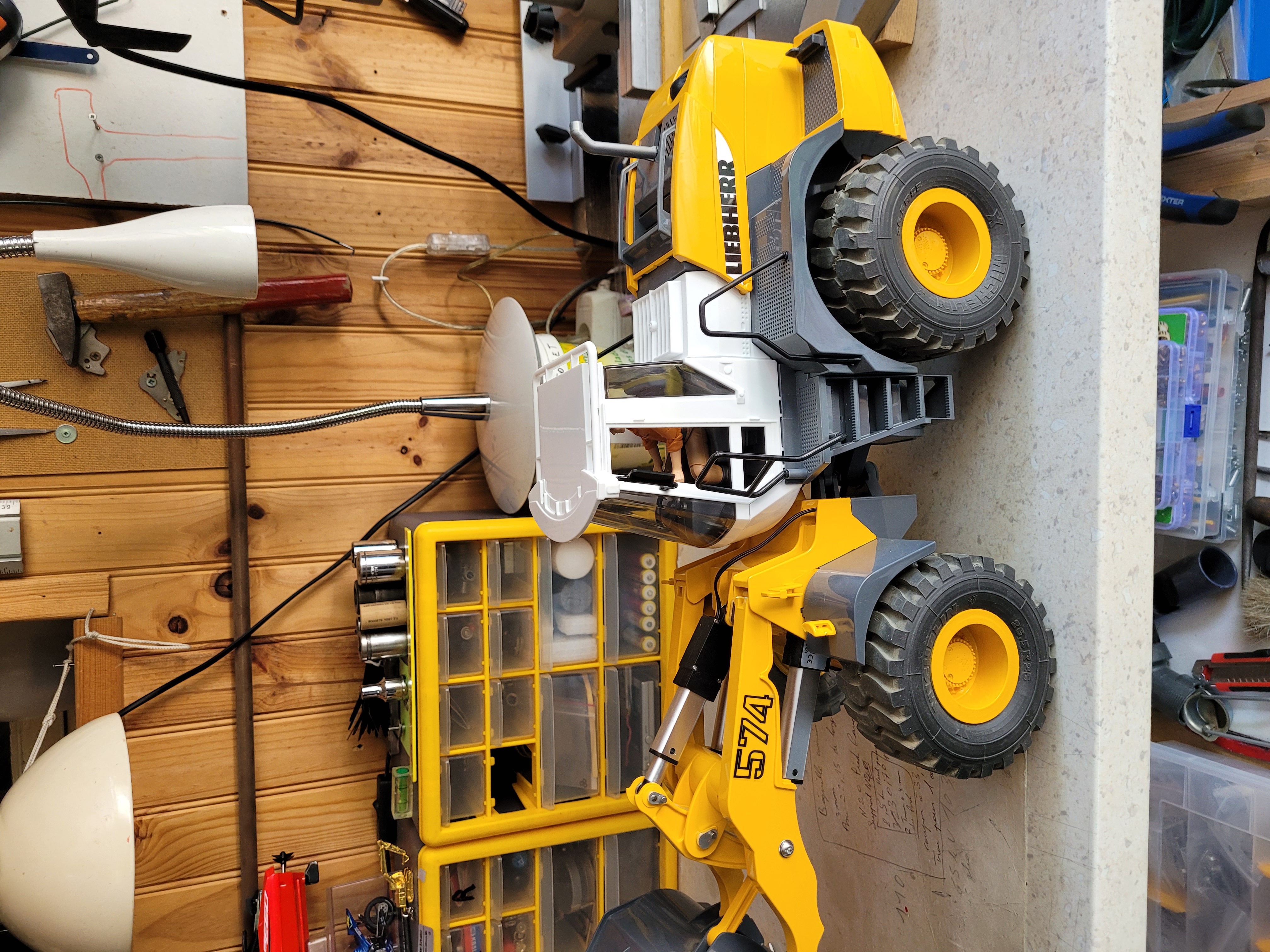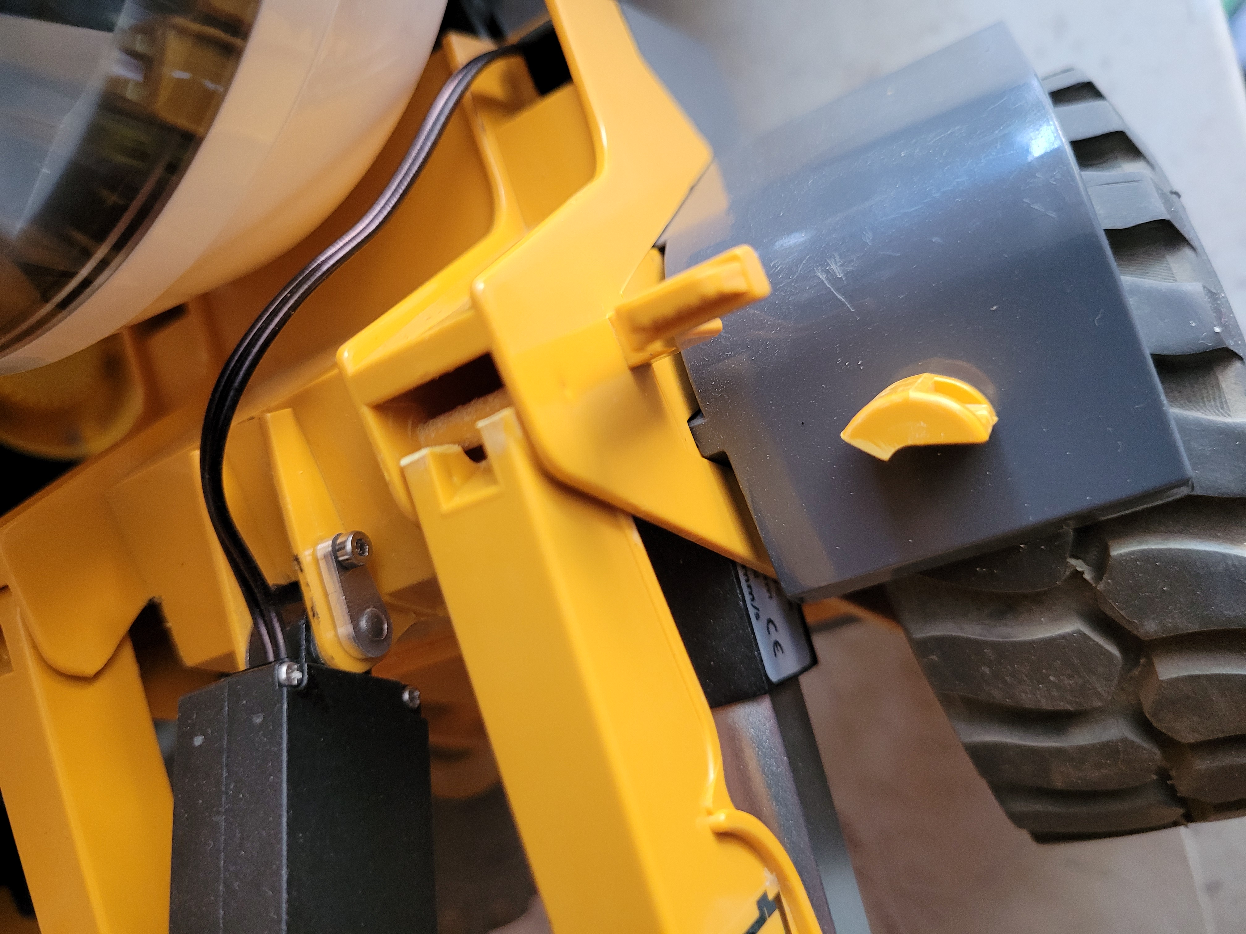 Alors le 574 dans ce beau sable n'a pas fait long feu, lui qui avait déjà chargé quelques camions dans les mois précédant, après avoir pris 2 godets de sable, (j'ai bien vu que le chargeur avait du mal car sable plus lourd que mes anciens matériaux et les vérins de 60N arrivent a leurs limite) le plastique du bras au niveau du pivot c'est rompu, visiblement le plastique bruder a ces limites !
