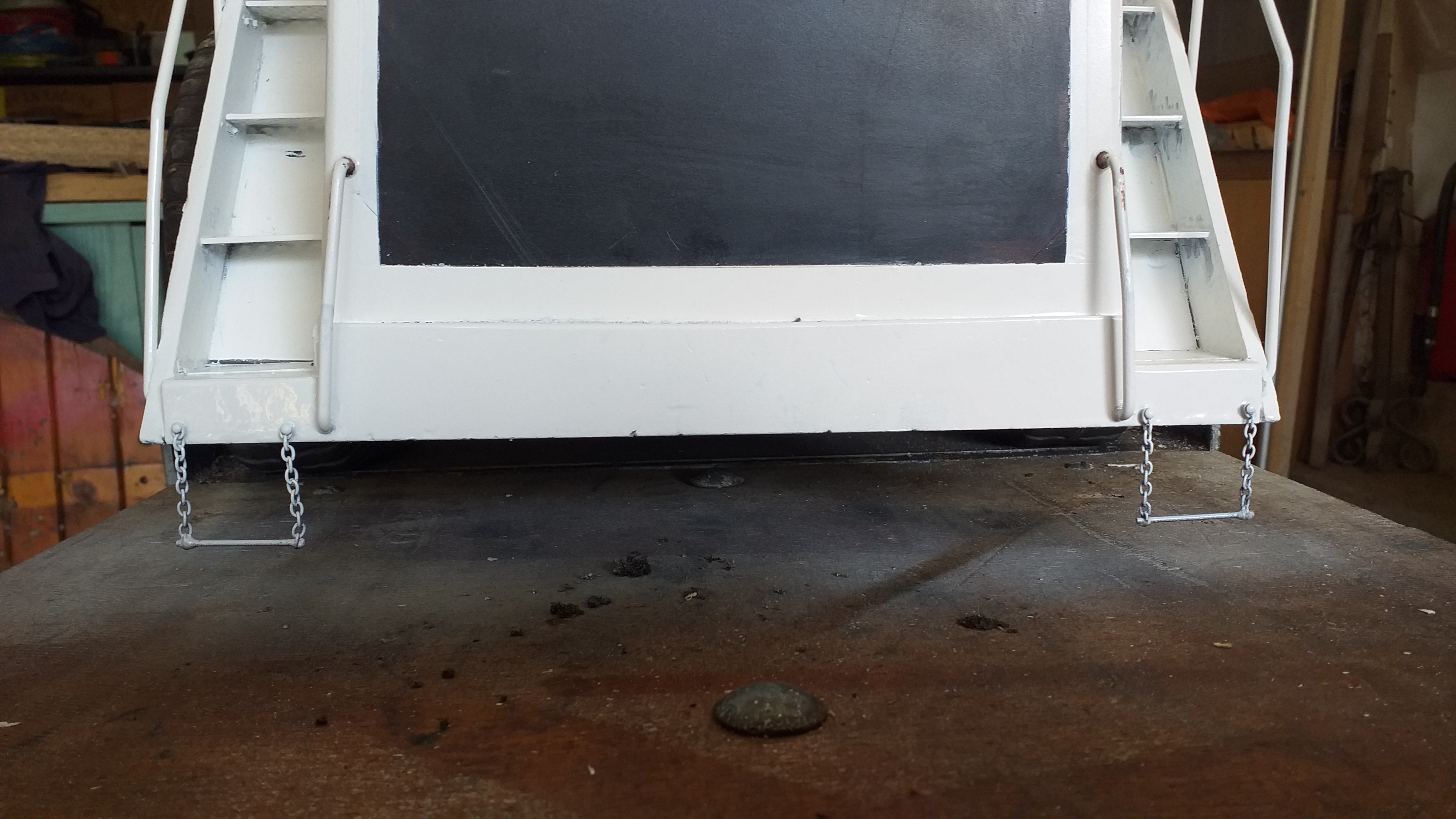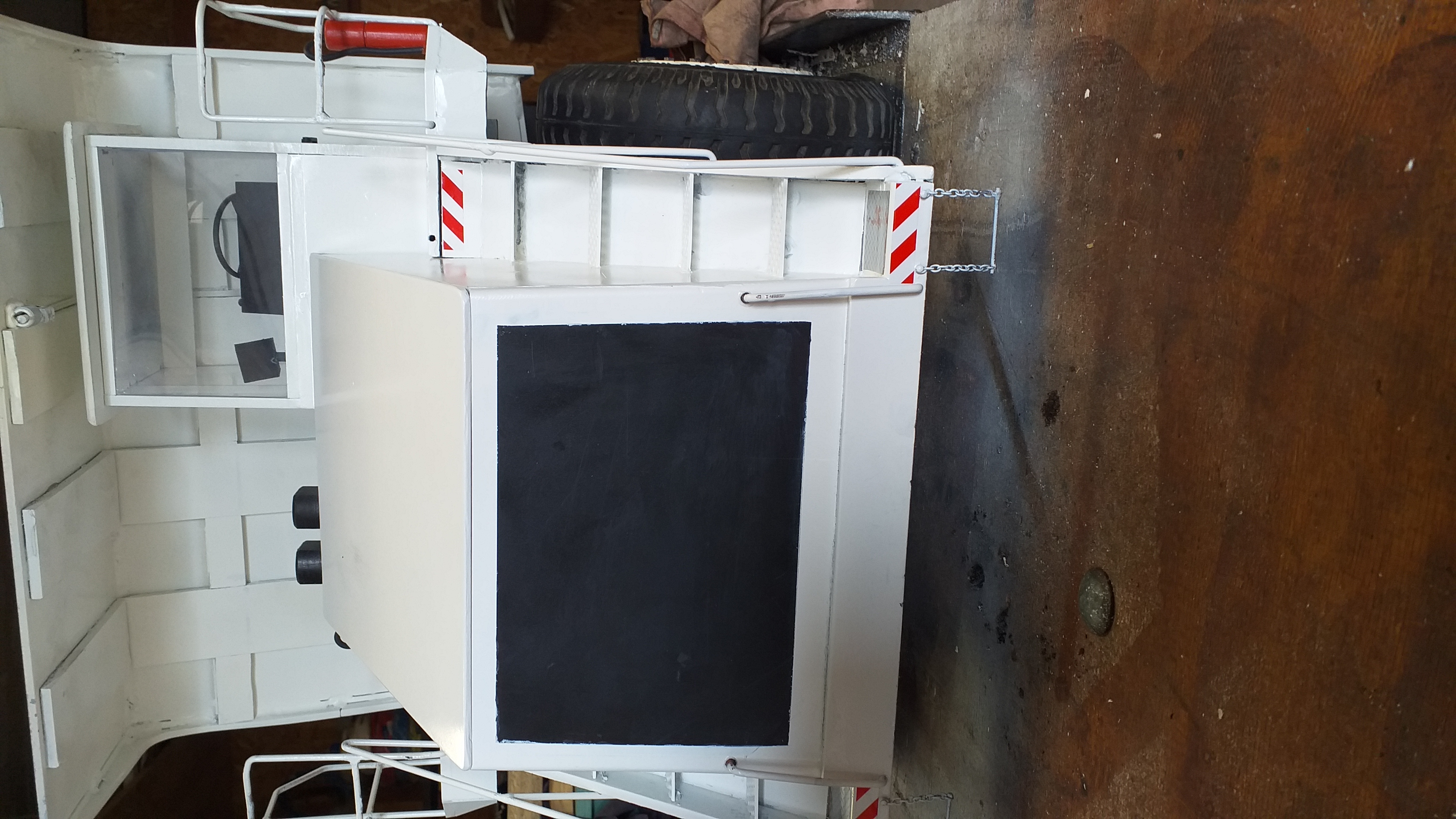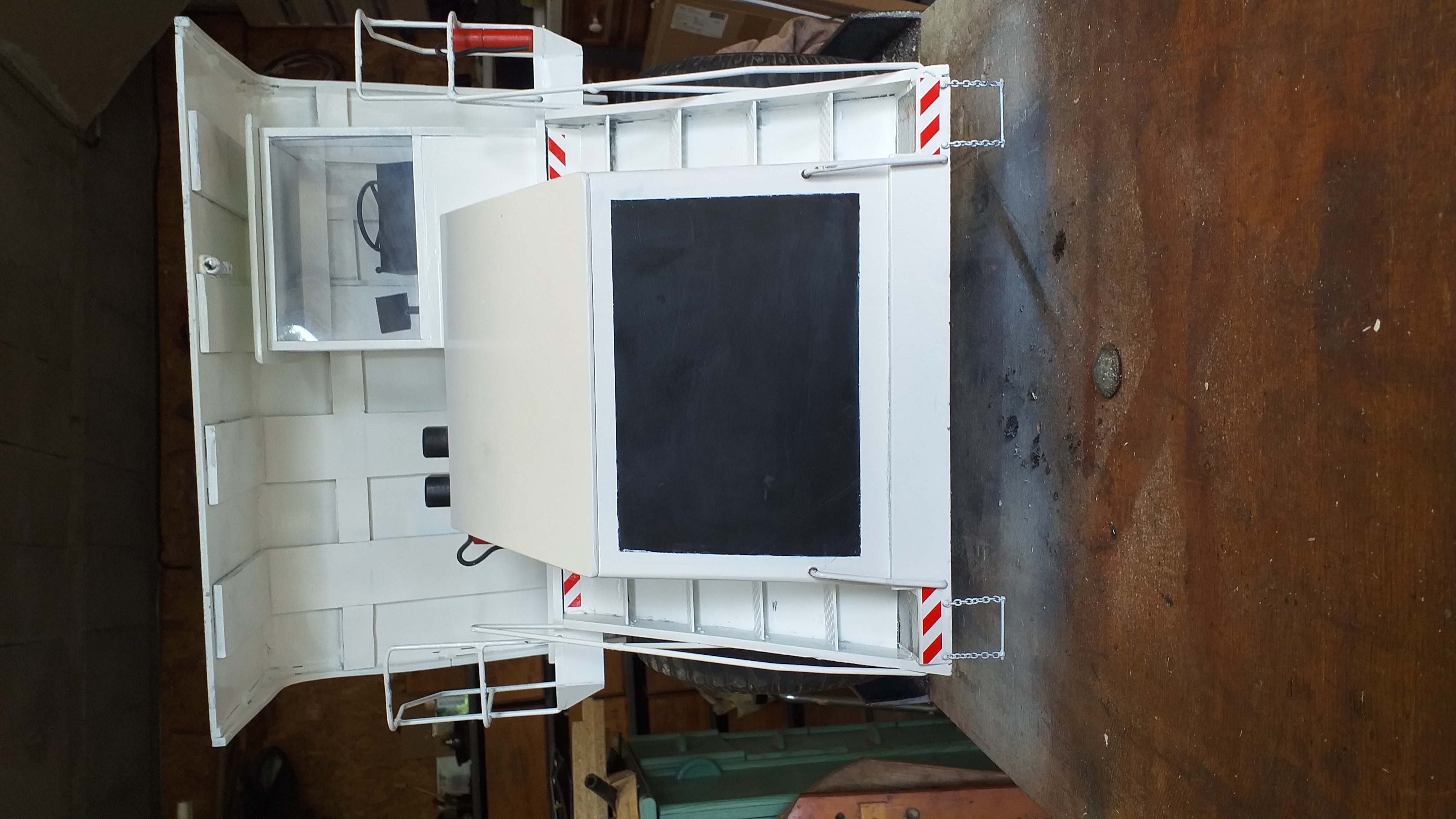 voici le resultat quasi final,il me reste a mettre le temoin de benne position abaissee.Un ruban devant la cabine,qui servira aussi pour le commutateur de mise sous tension de la puissance.