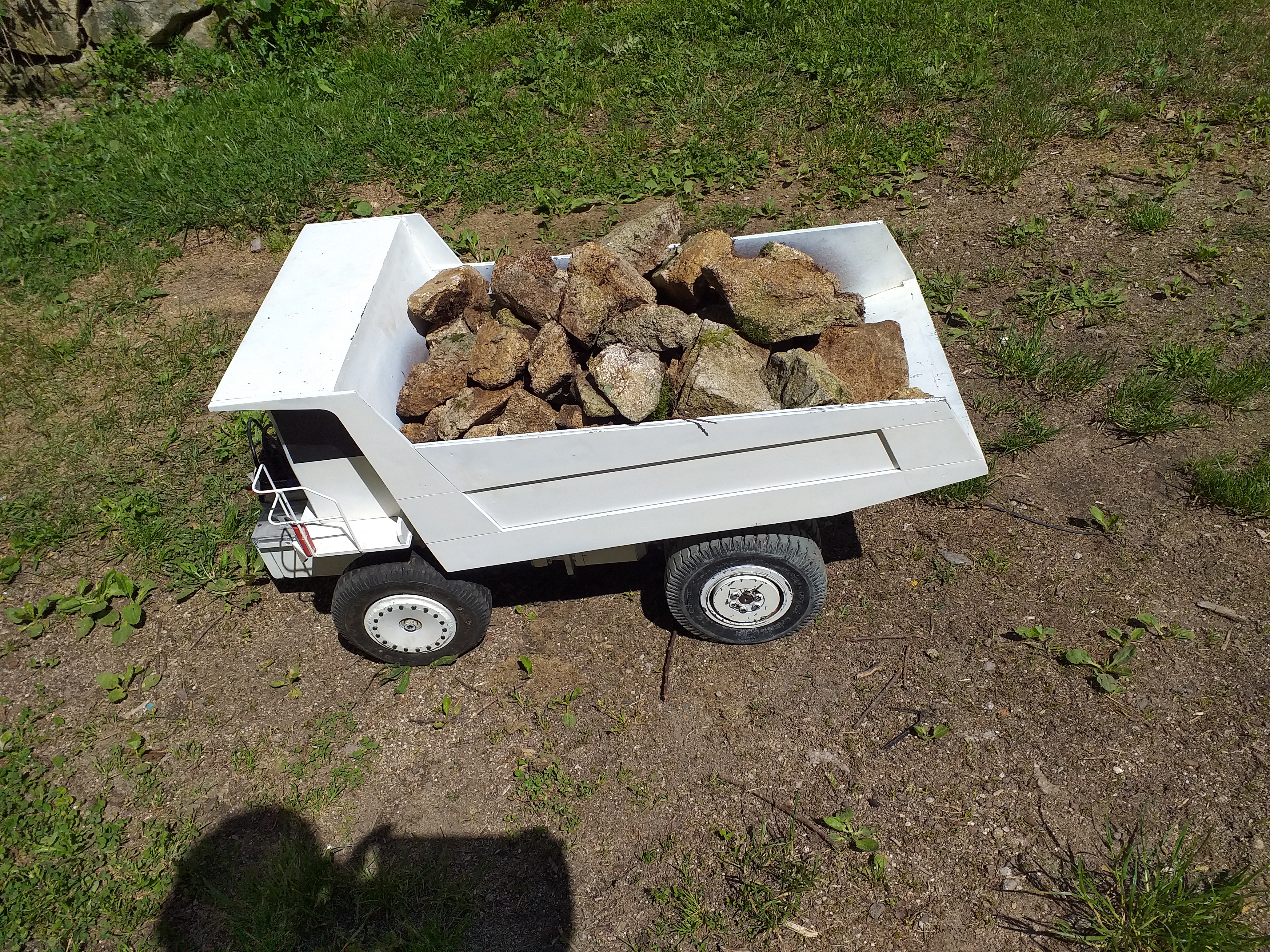 Le dumper pese 65 Kg vide,tu ajoute 40 Kg de terre........Il n'y a qu'un moyen meca pour cette fonction