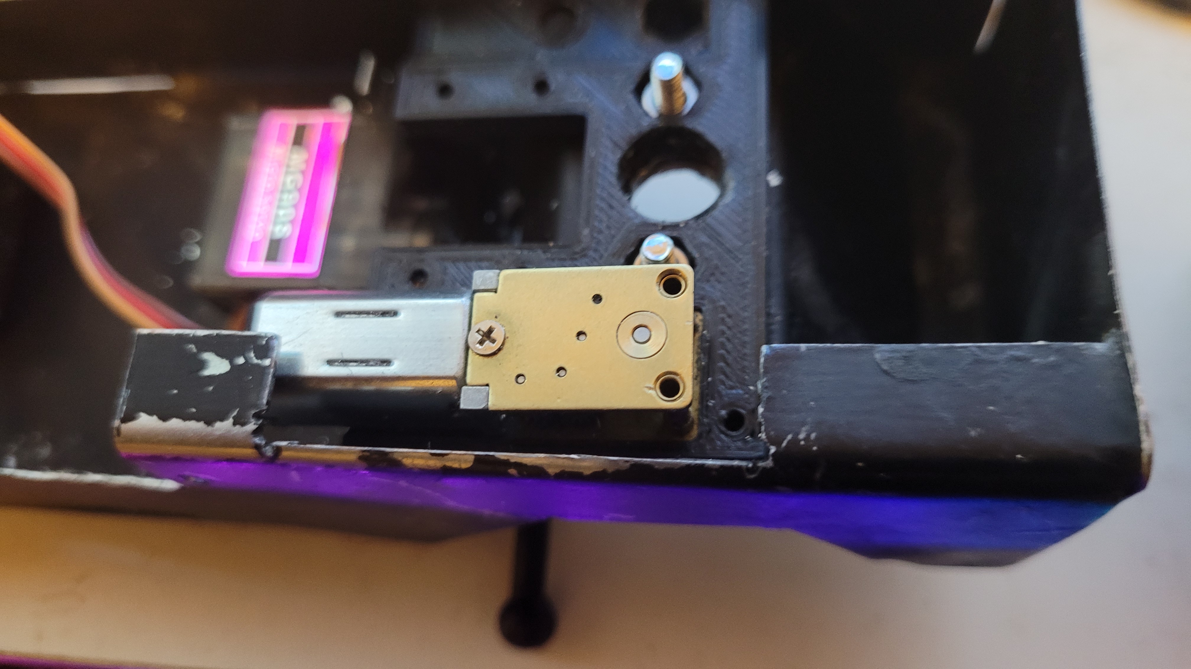 Après la vidéo du chassis roulant, des photos de l'agencement de la pelle. le réservoir ira à l'avant droite à coté du moteur de tourelle. le panier noir recevra un accu 2S en 3300Mah 18650. pour le pignon, j'ai réalésé le pignon fourni avec la couronne intérieure à 4.5mm et réduit l'axe du réducteur de 6 à 4.5. Une petite plaque imprimé de 2.5mm permet de surélever le réducteur et que le pignon ne touche pas le fond de la barbette