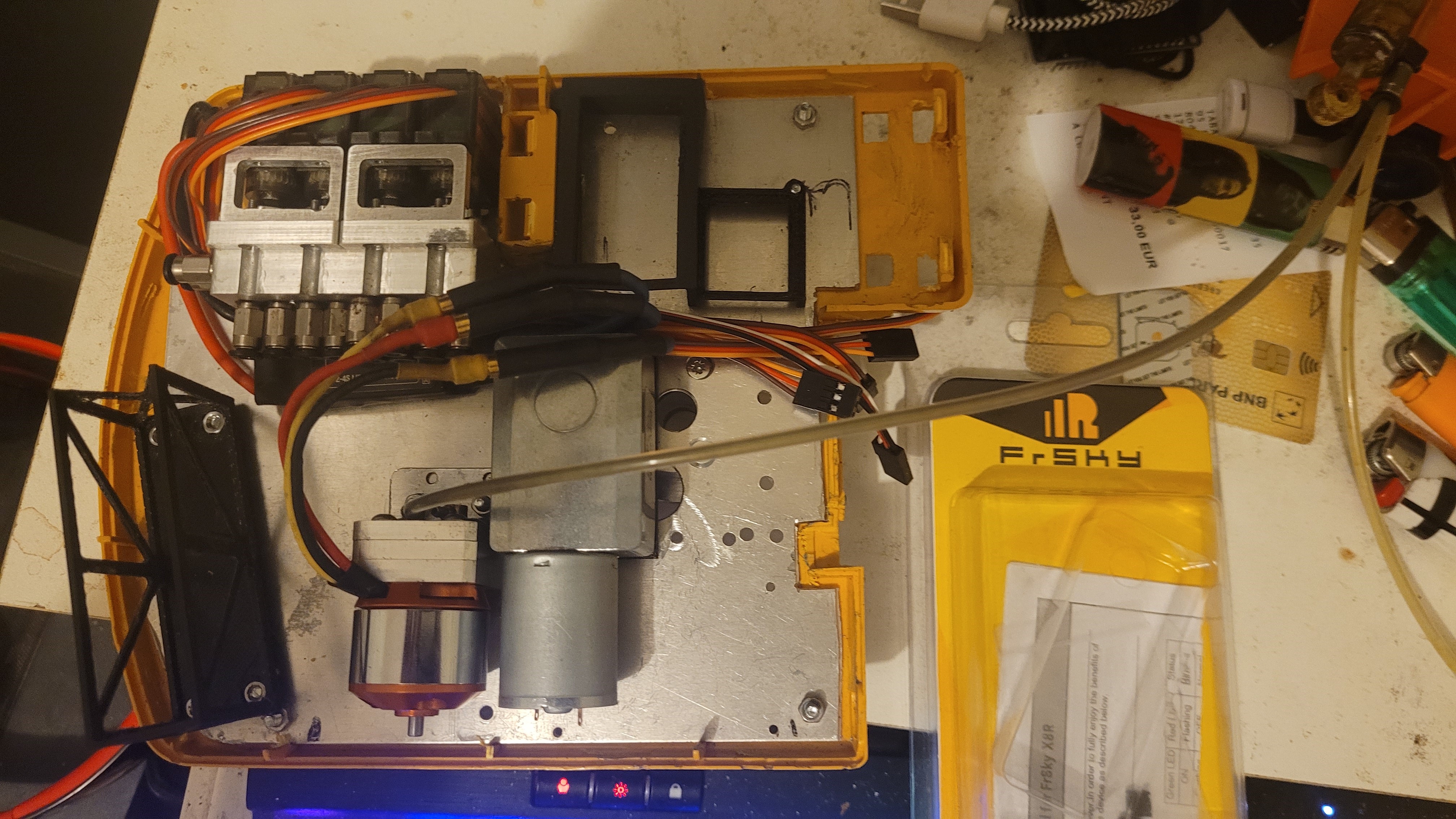 Quelques nnews sur la pelle. Elle roule enfin. une petite vidéo. Elle est donc animée par 4 moteurs GA050-125, 1 par roue, double direction, différentiel électronique géré par la taranis, avec changement du mode de direction (2 roues, 4 roues, crabe)