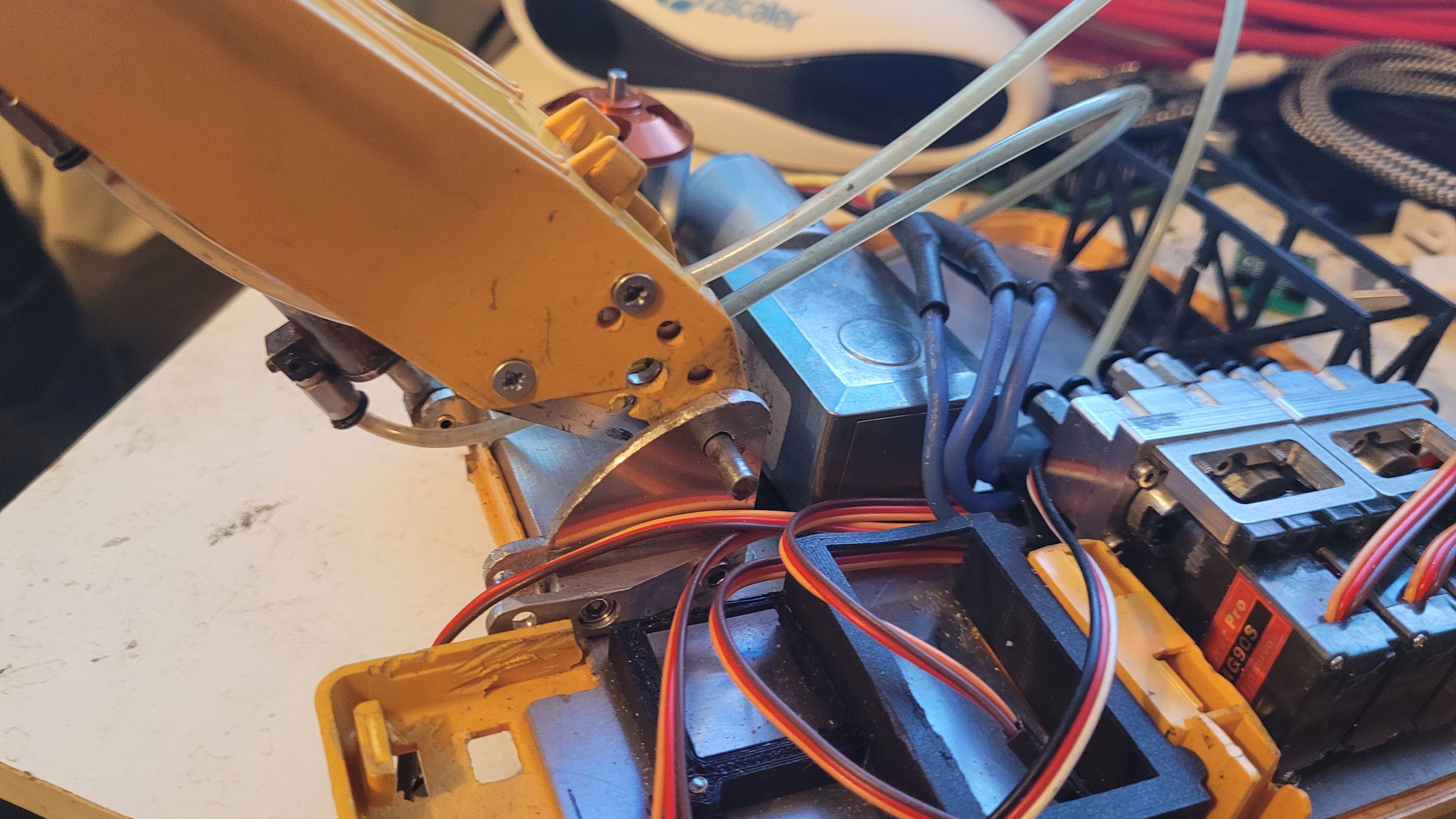 Des nouvelles de la pelle. J'ai refait le support de flèche, il est bien mieux comme çà. J'ai également déplacé la pompe ce qui me permet de mttre un réservoir de 90ml au lieu des 43 initialement prévus.