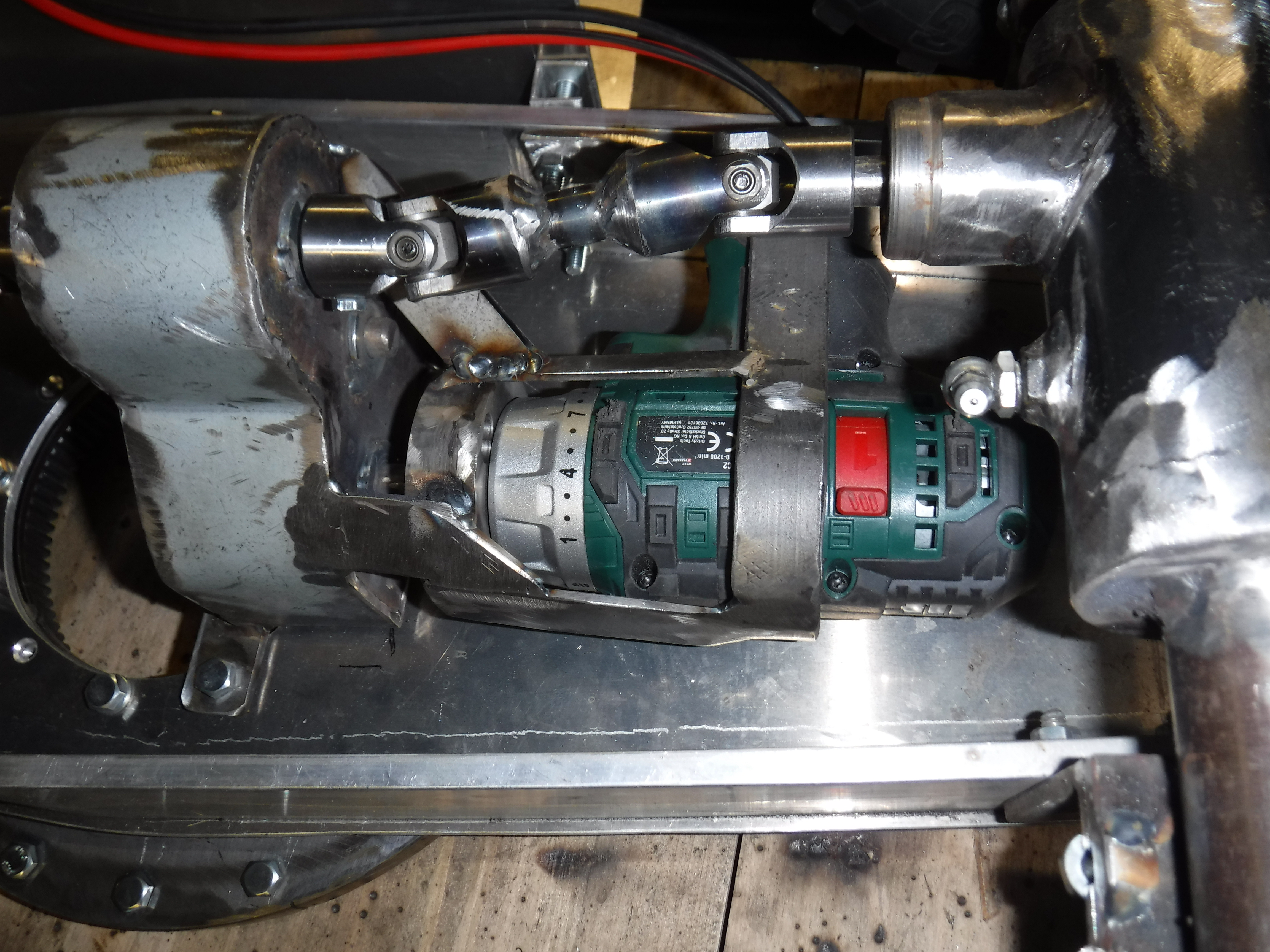 alors vous devez vous demander mais comment il arrive à transmettre le mouvement car comme vous le voyez il n y a pas de mandrin; en fait le mandrin était déclipsable et j' ai mis un embout de visseuse de vis hexagonale qui est soudé sur l arbre du premier pignon.