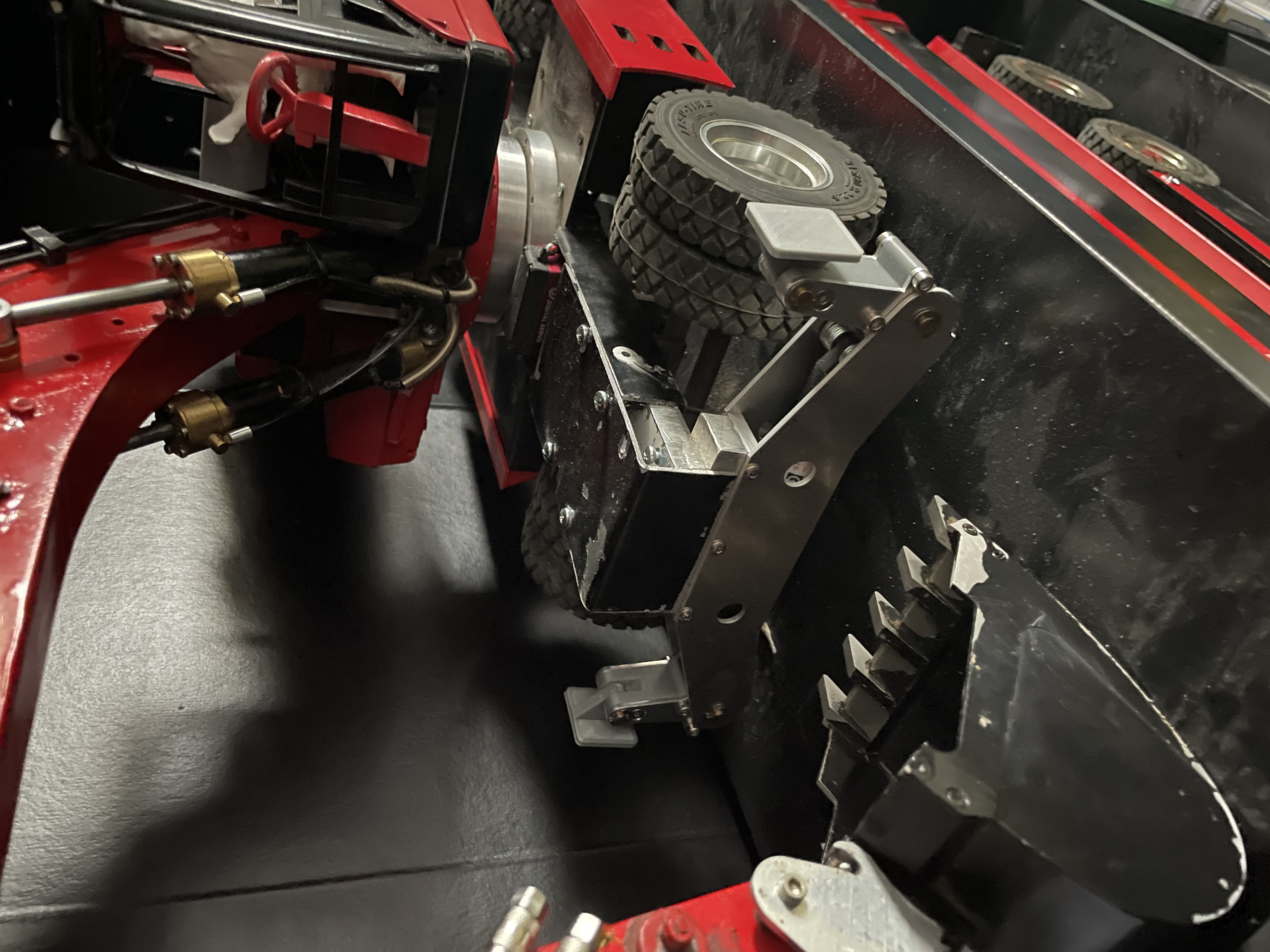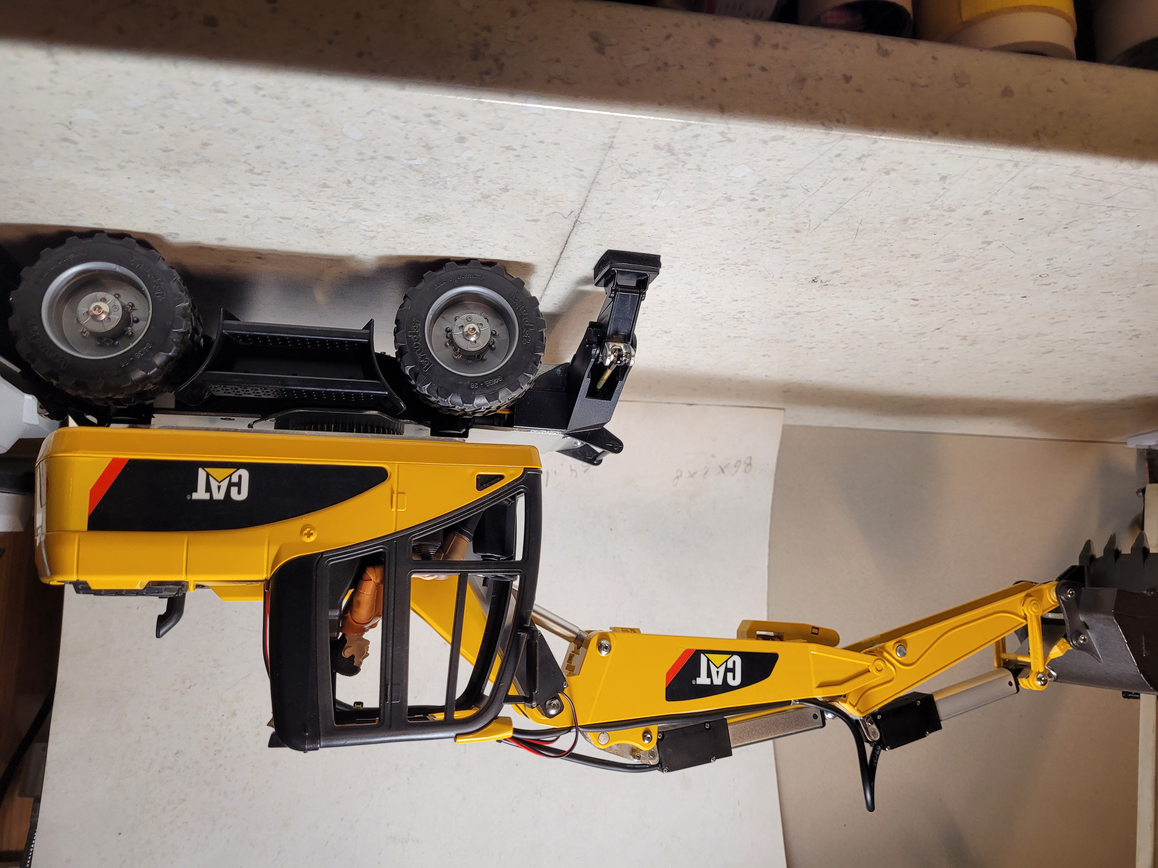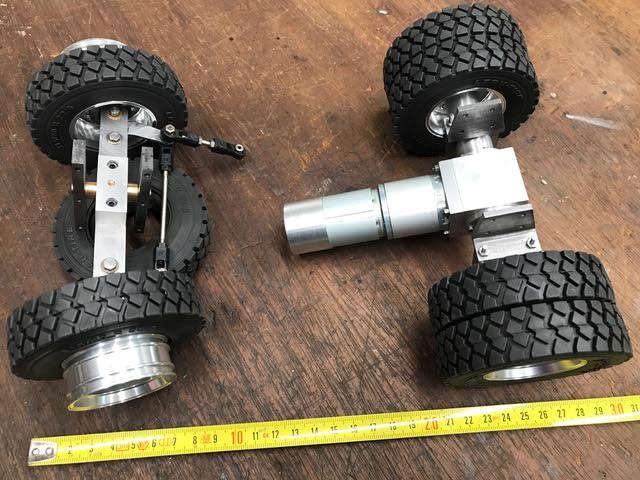Perso j'ai réalisé la pelle cat à pneus avec son châssis d'origine, c'était pas simple, j'ai du couper plusieurs fois et à plusieurs endroit le châssis pour avoir un angle de braquage correct, car d'origine il n'y a pas assez de place pour que les roues tourne, pour les stabs j'ai utilisé 2 minis servos avec 2 ressorts pour que la tringlerie ne coince pas, sa fonctionne plutôt bien, chaque stabs est indépendant...Si sa peut aider...