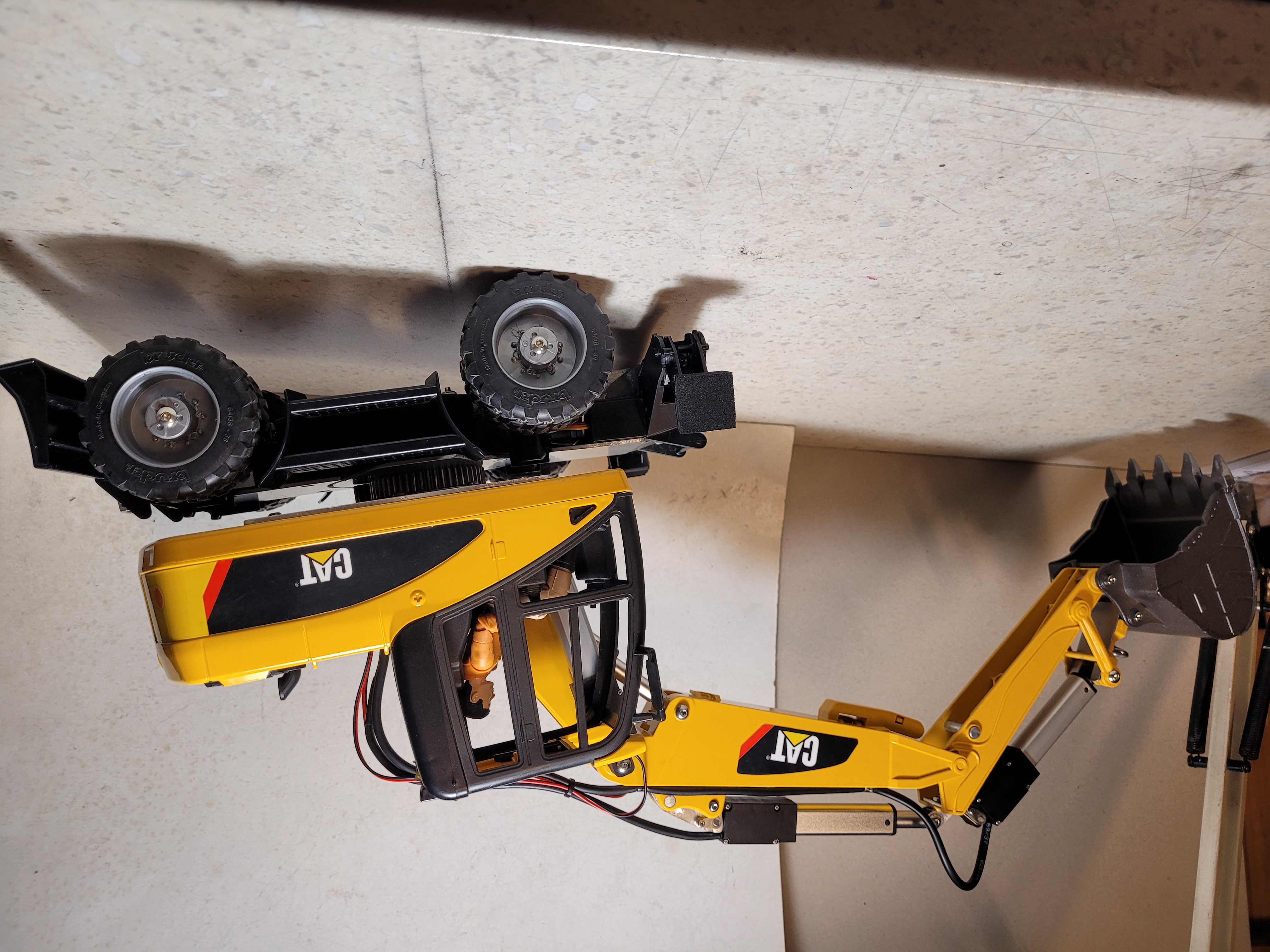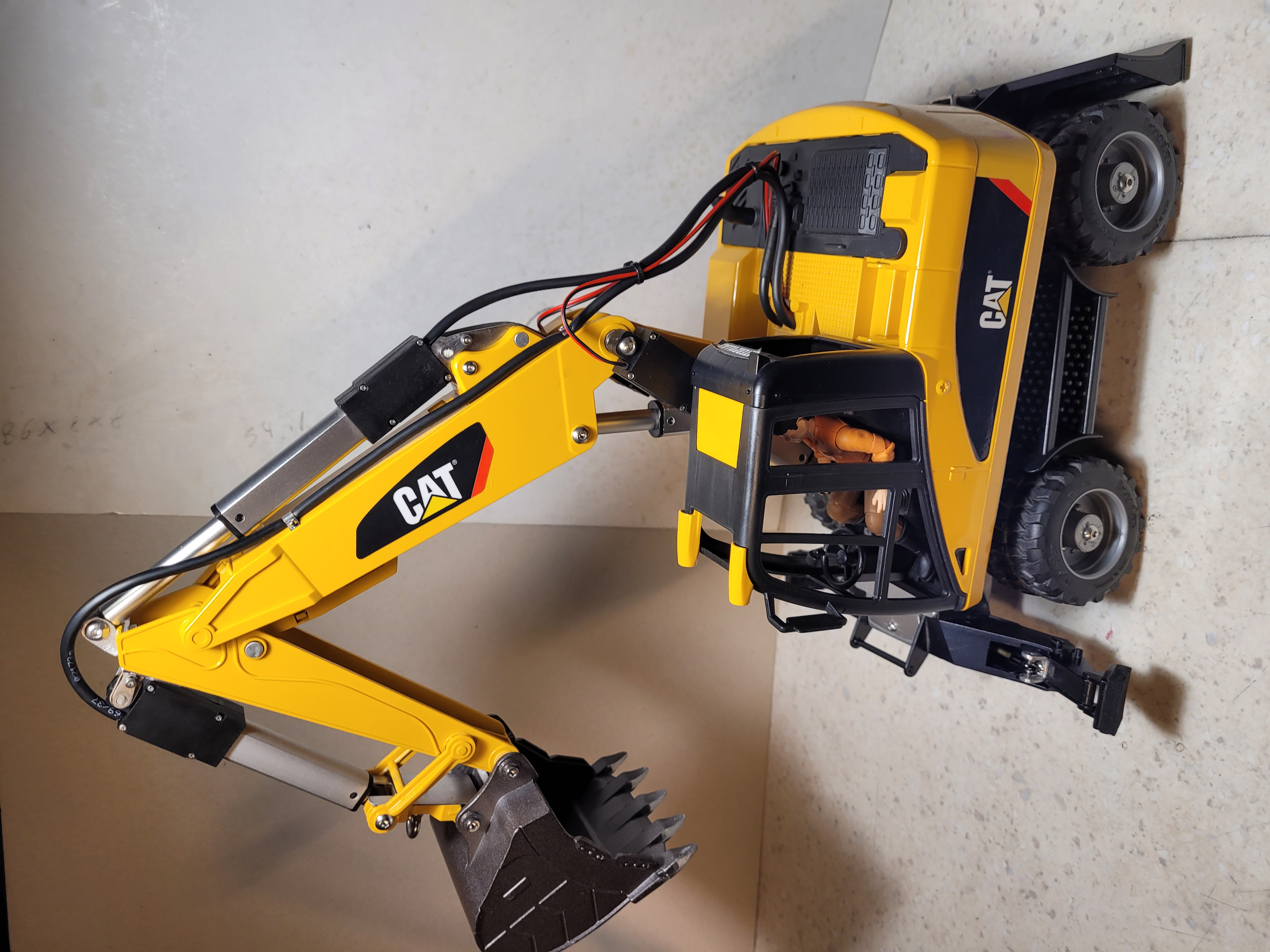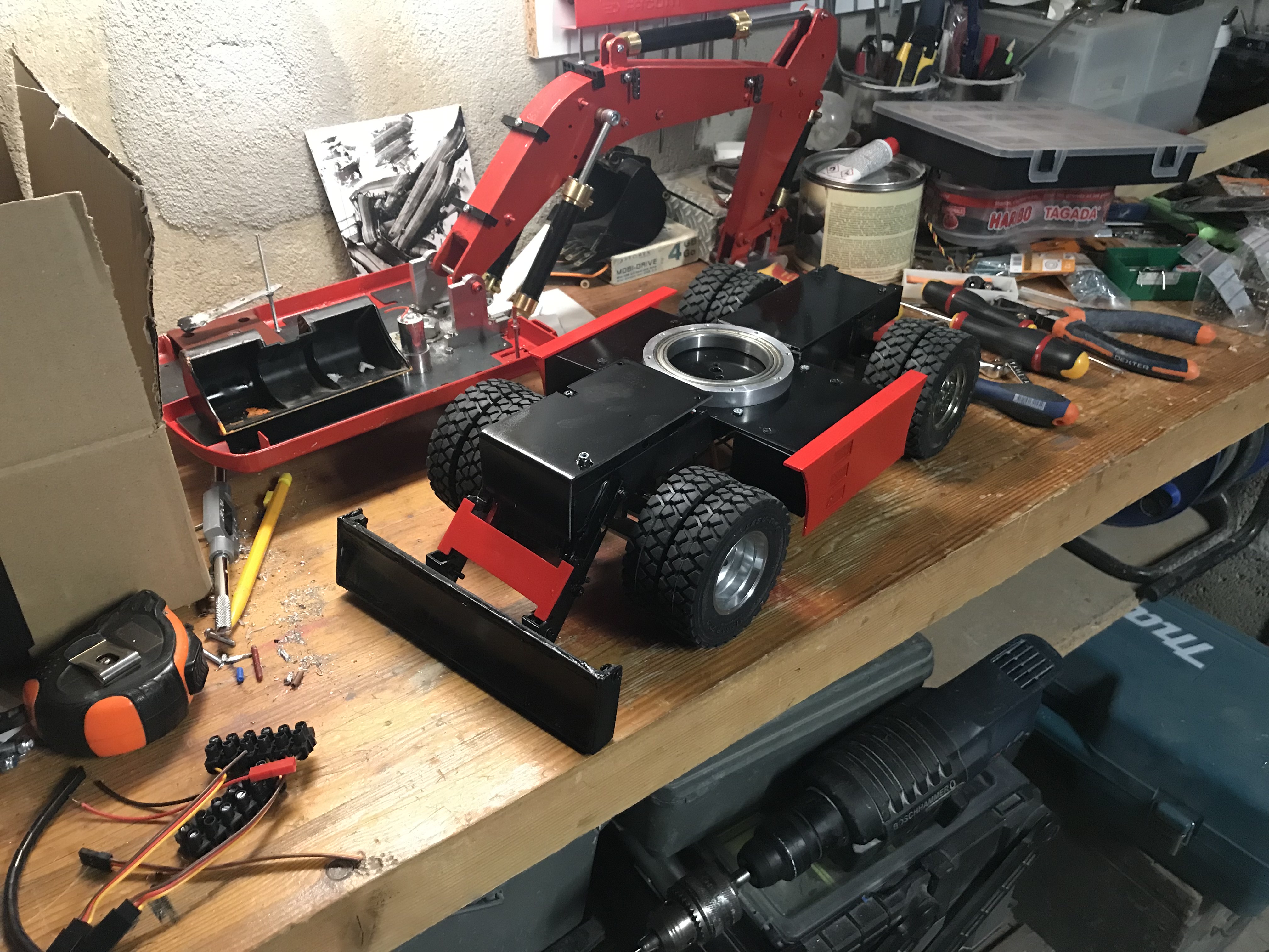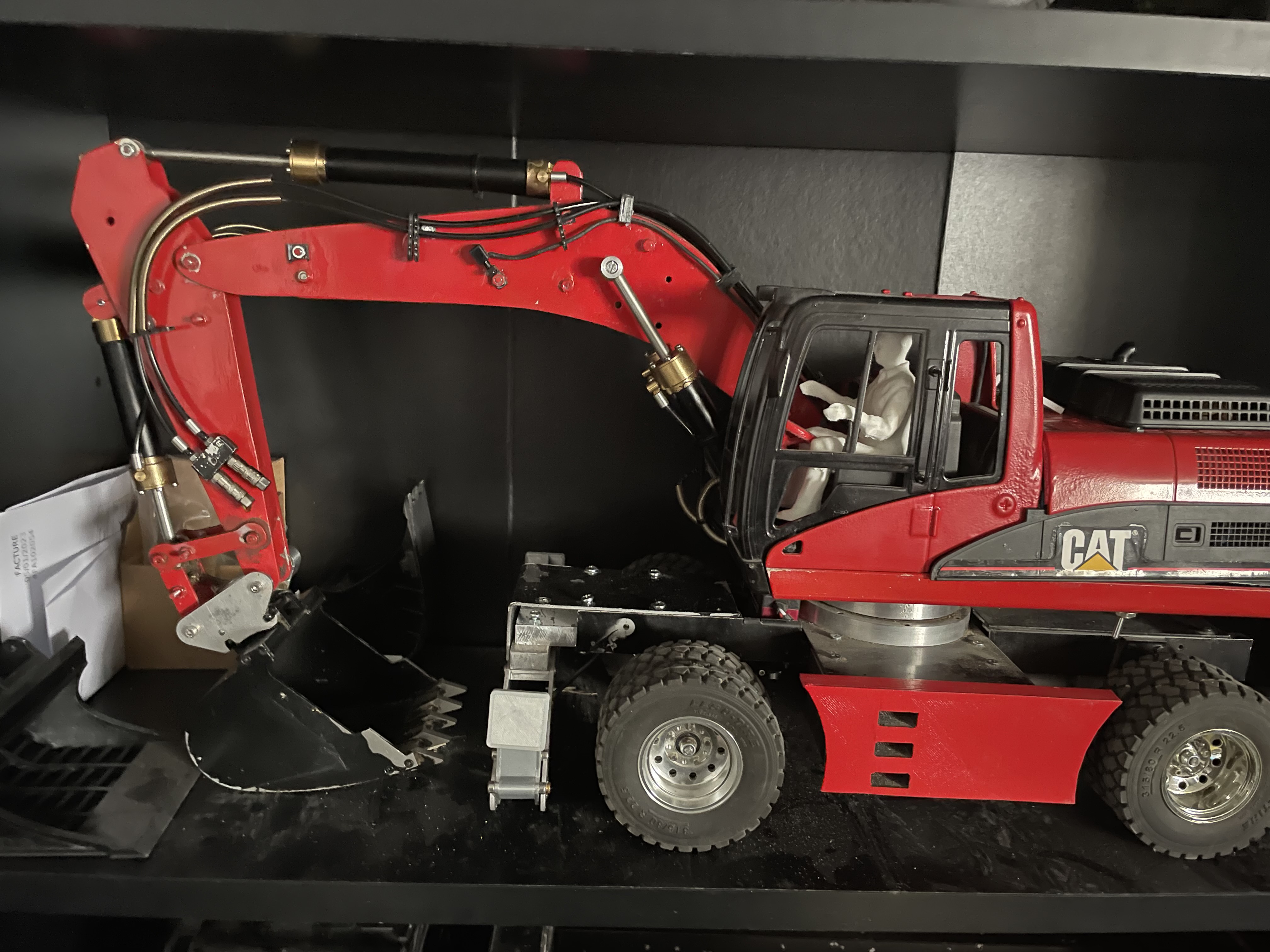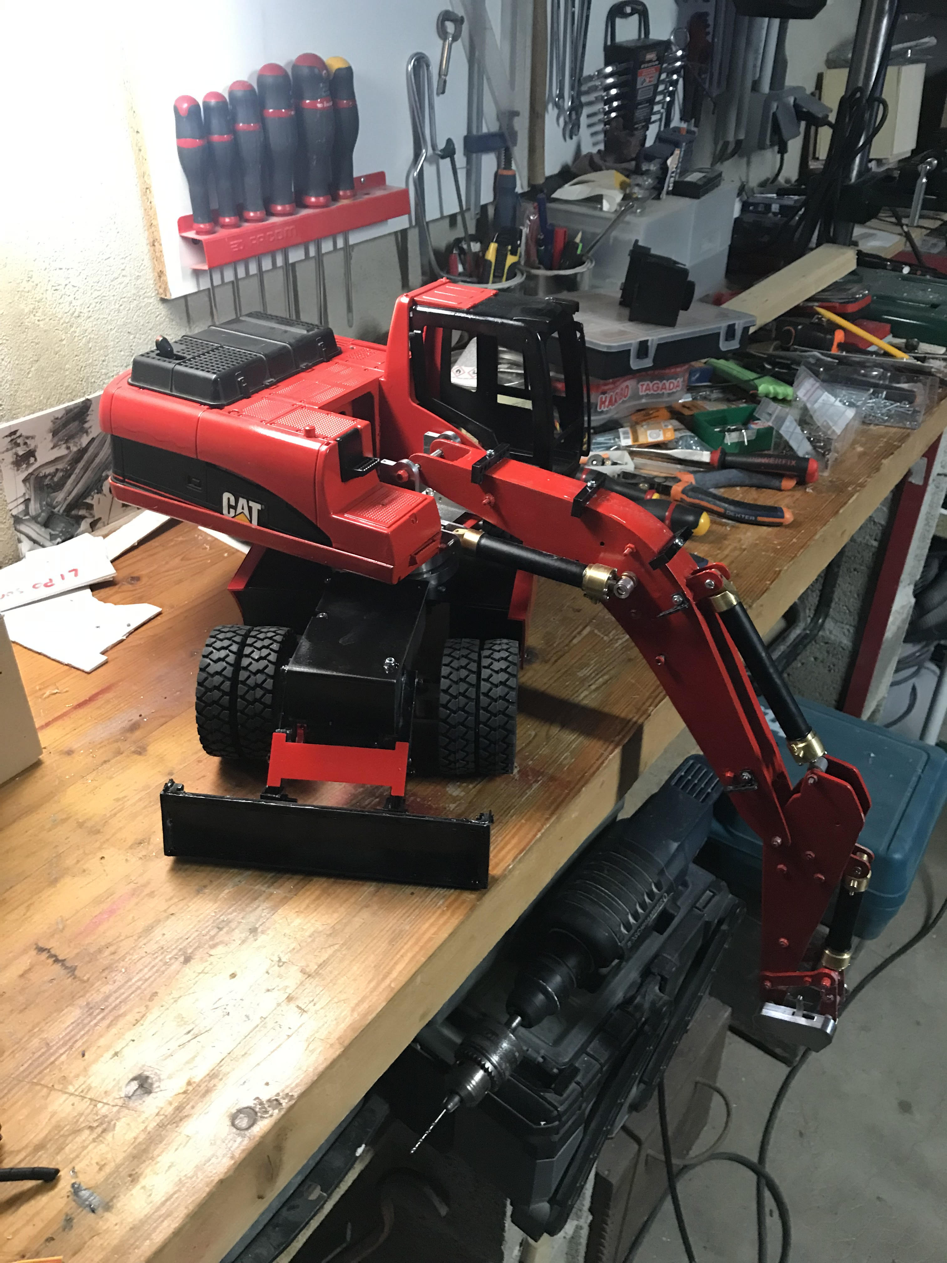 elle est en 4x2 avec des trains réalisés sur mesure (pas par moi), cabine bruder, bras alu, hydro magom. la pelle n'est pas finie à ce jour, il me reste encore un stab a mettre, des attentes auxiliaires élec (2). au début je lui avais fait une lame a l'avant mais je l'ai remplacé par un stabilisateur CTI