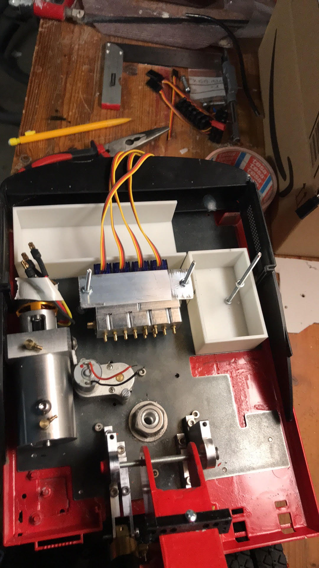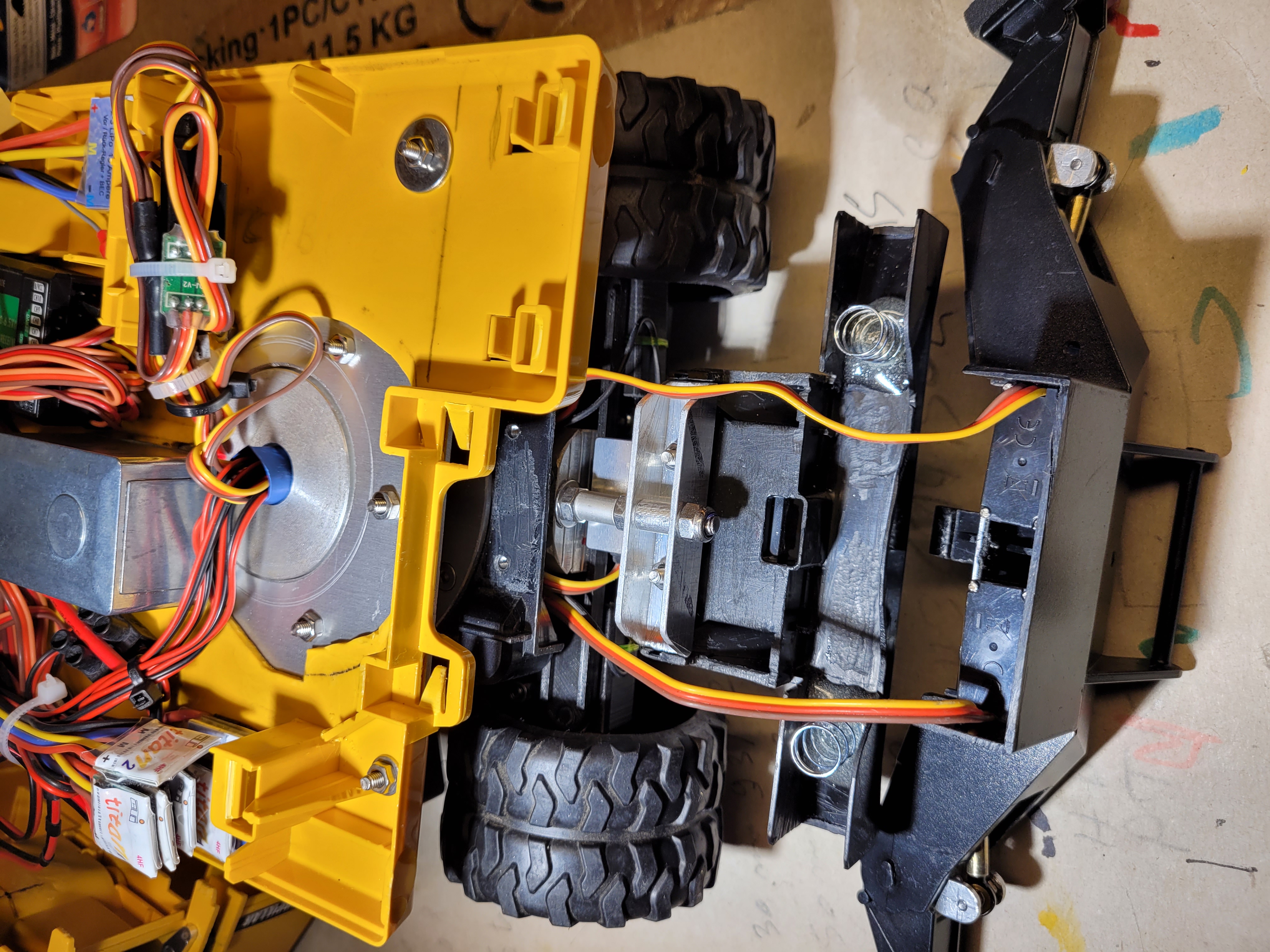 Il faut que je lui mette du poids à l'arrière car avec un godet Huina en metal sans stab sa bascule lol !