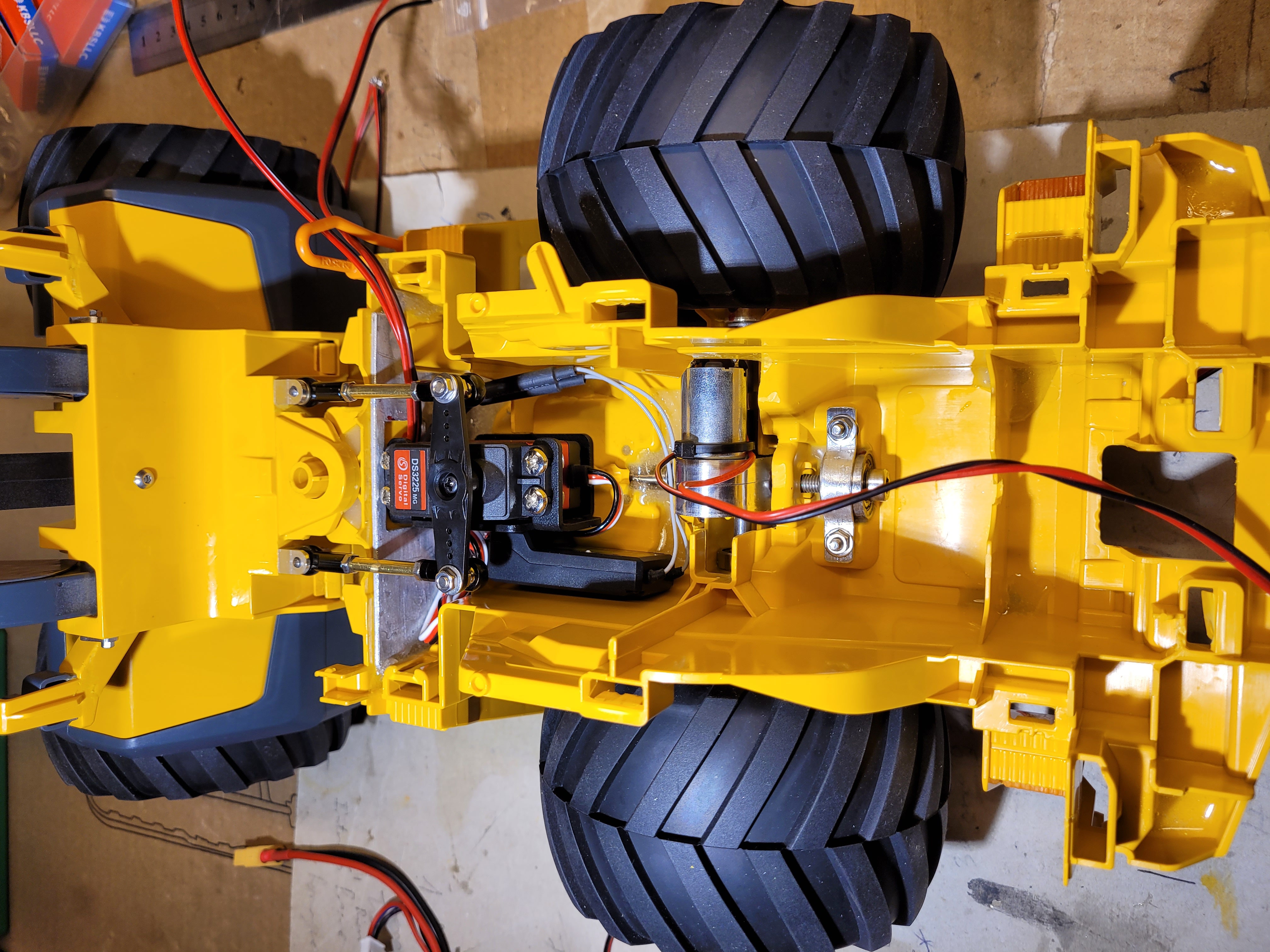 pour la direction je redémultiplie le servo avec un pignon tout mes engins articulé sont fait comme ça sa tourne moins vite mais sa force pas et dans le temps c'est fiable. viewtopic.php?f=5&t=2301&start=20