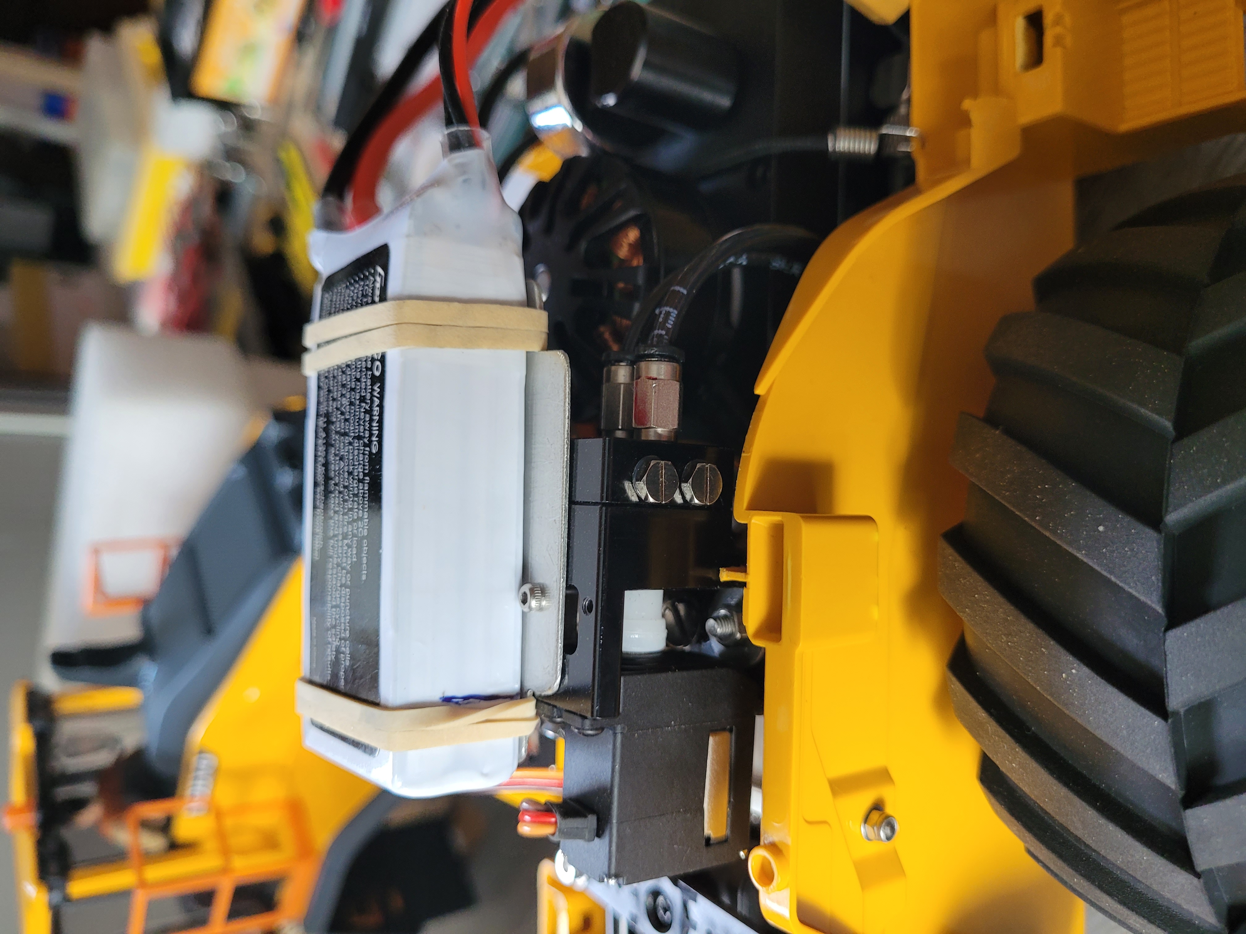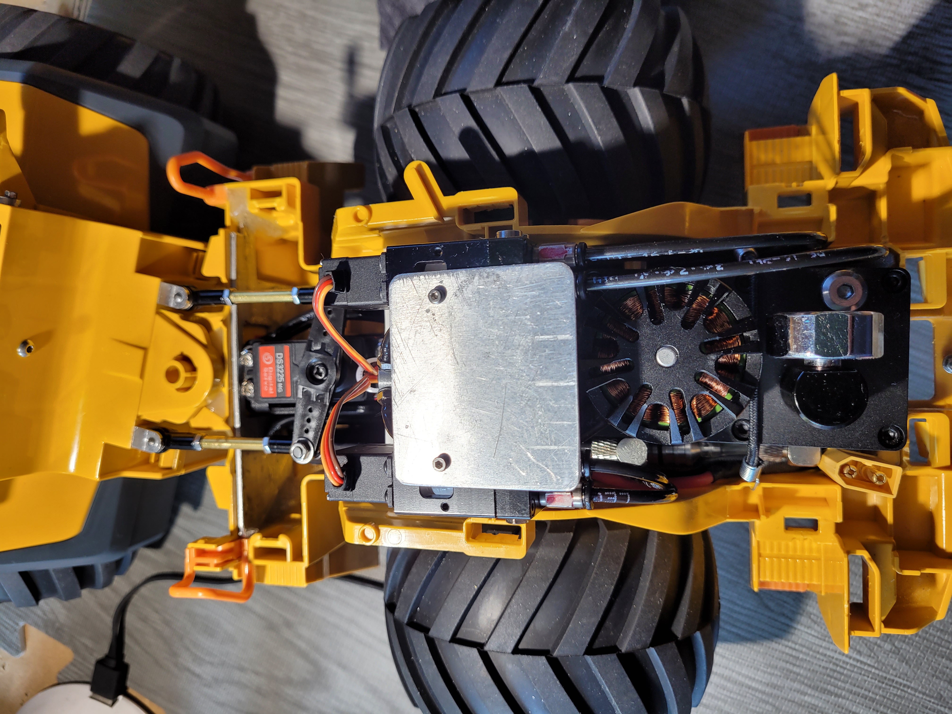 Lui est totalement électrique avec des vérins chinois actionneurs linéaire et des moteurs de transmission a chaque roues de 25 mm et 100 rpm.