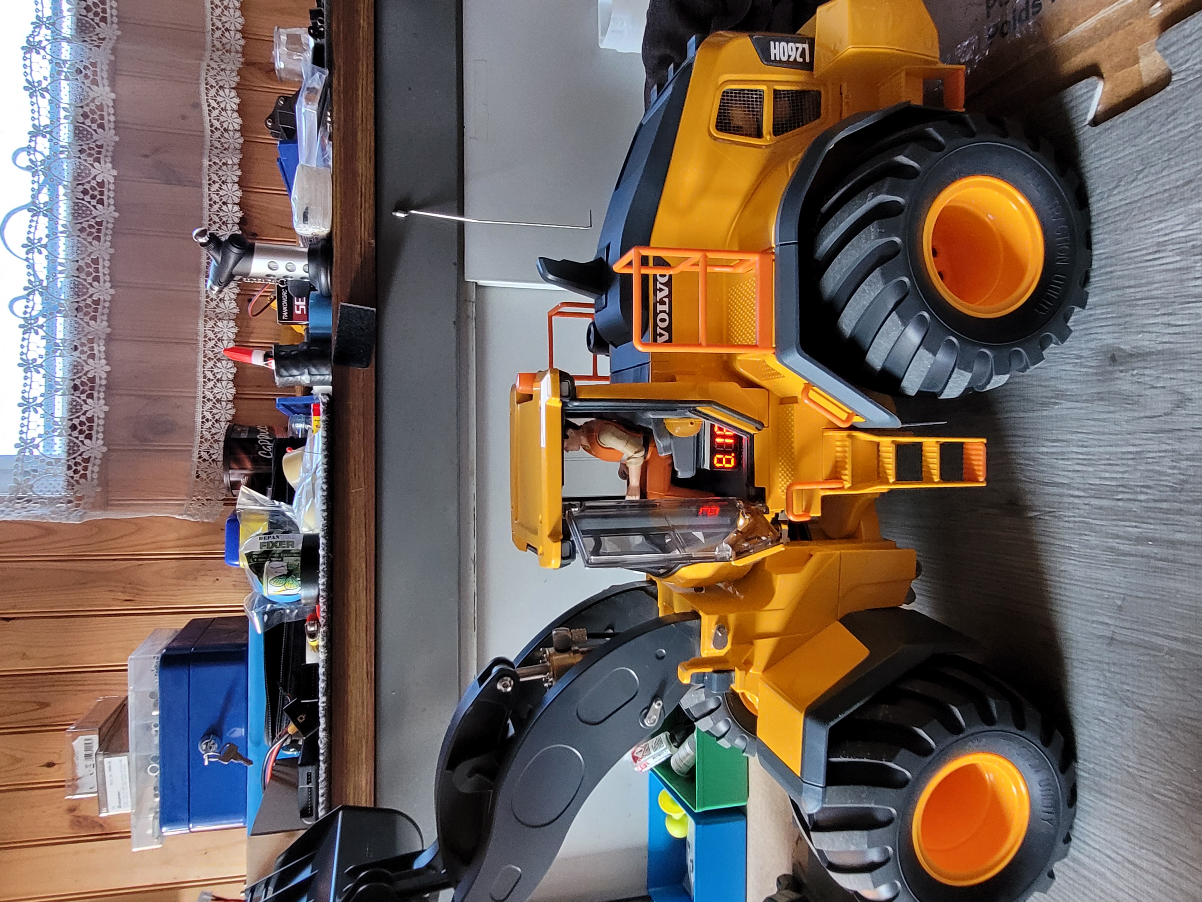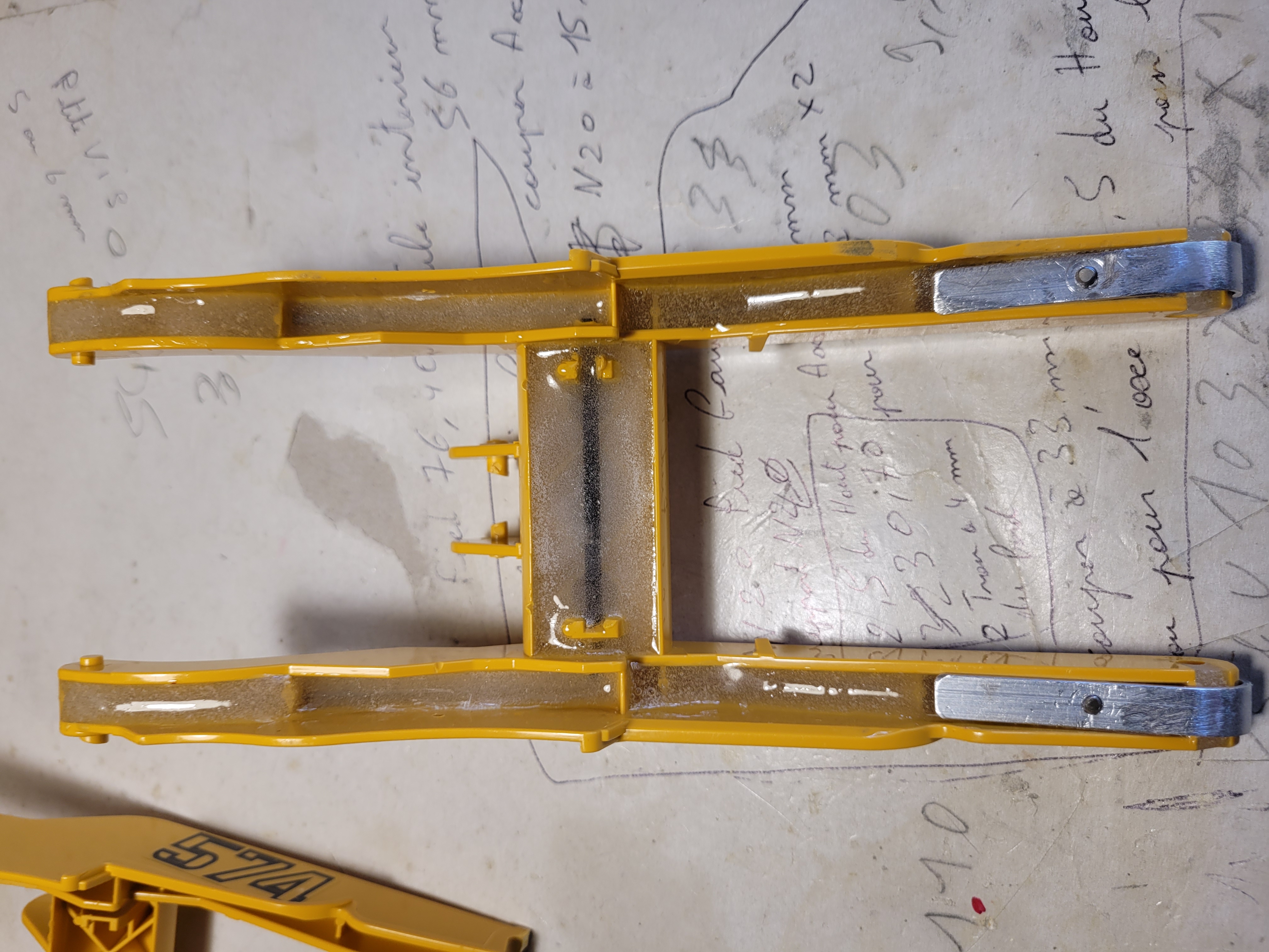 Voila pour le 574 le bras est fini, corde a piano de 2mm + epoxy dans toute les parties creuse du bras, plus que quelques retouche peinture, la sa pousse bien, sa lève bien, godet bien rempli...je vais juste changer les 2 vis du bras pour mettre des têtes fraisées