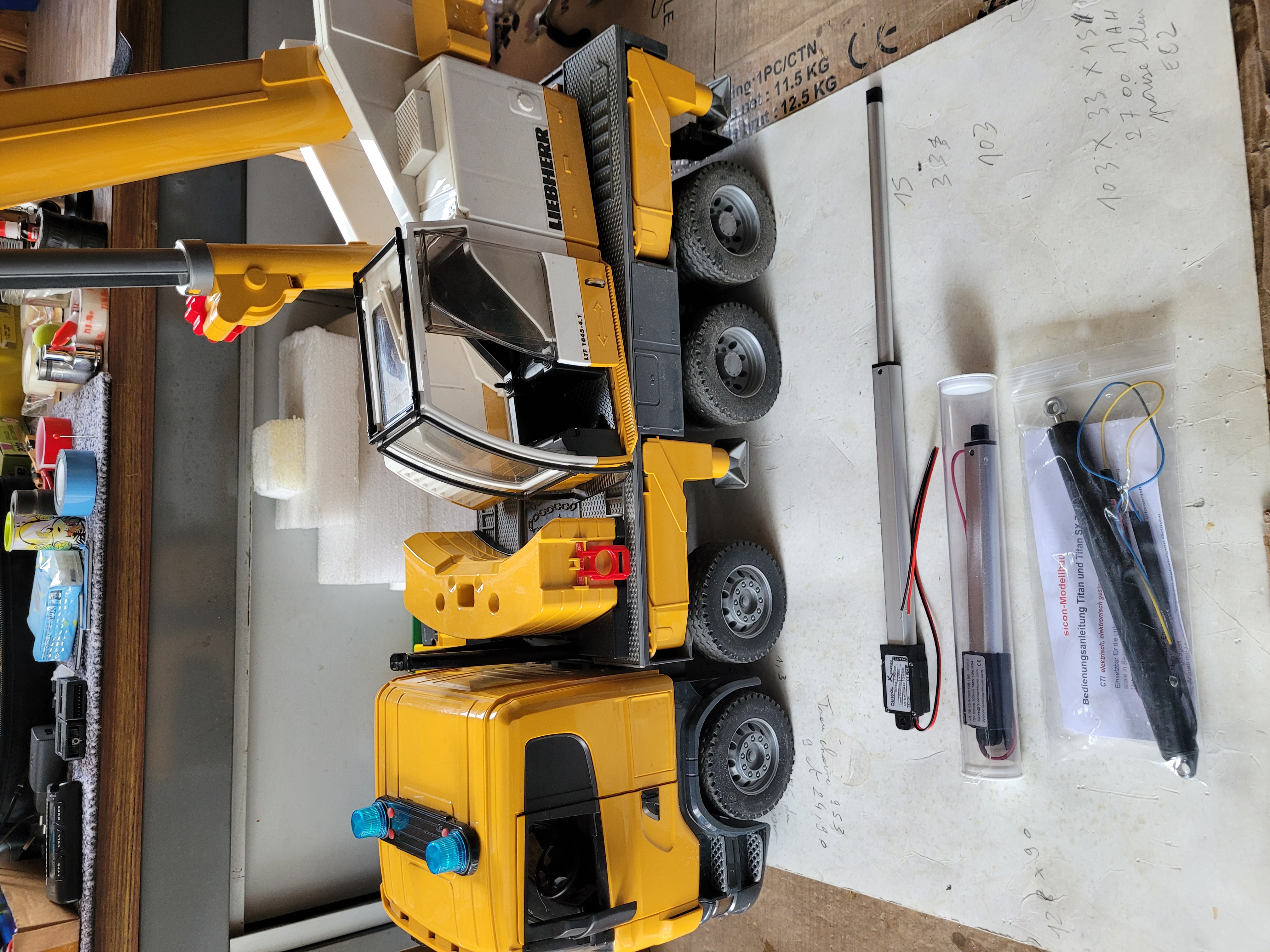 J'ai commencer la conversion sur la partie grue du modèle, le vérin de levage a trouver sa place avec un actionneur de 150mm placer plus bas que celui d'origine, avoir si assez costaux pour soulever les charges !