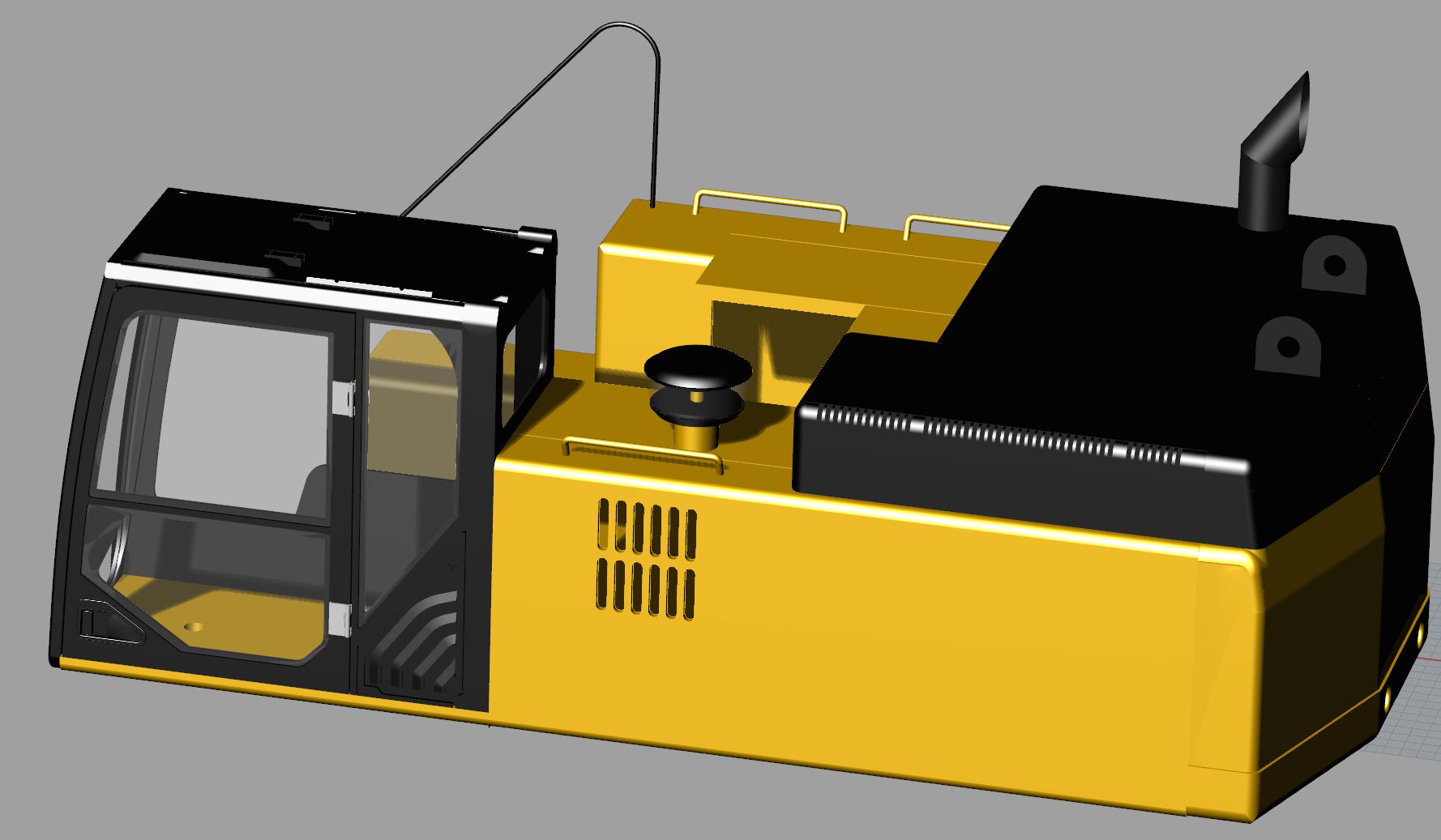 Tout d'abord la conception : - La cabine est complètement refaite conception sur le dernier modèle CAT. Elle est réalisée en impression 3D. - Le contrepoids est usiné dans la masse. - Le capot impression 3D et usinage (solution hybride).