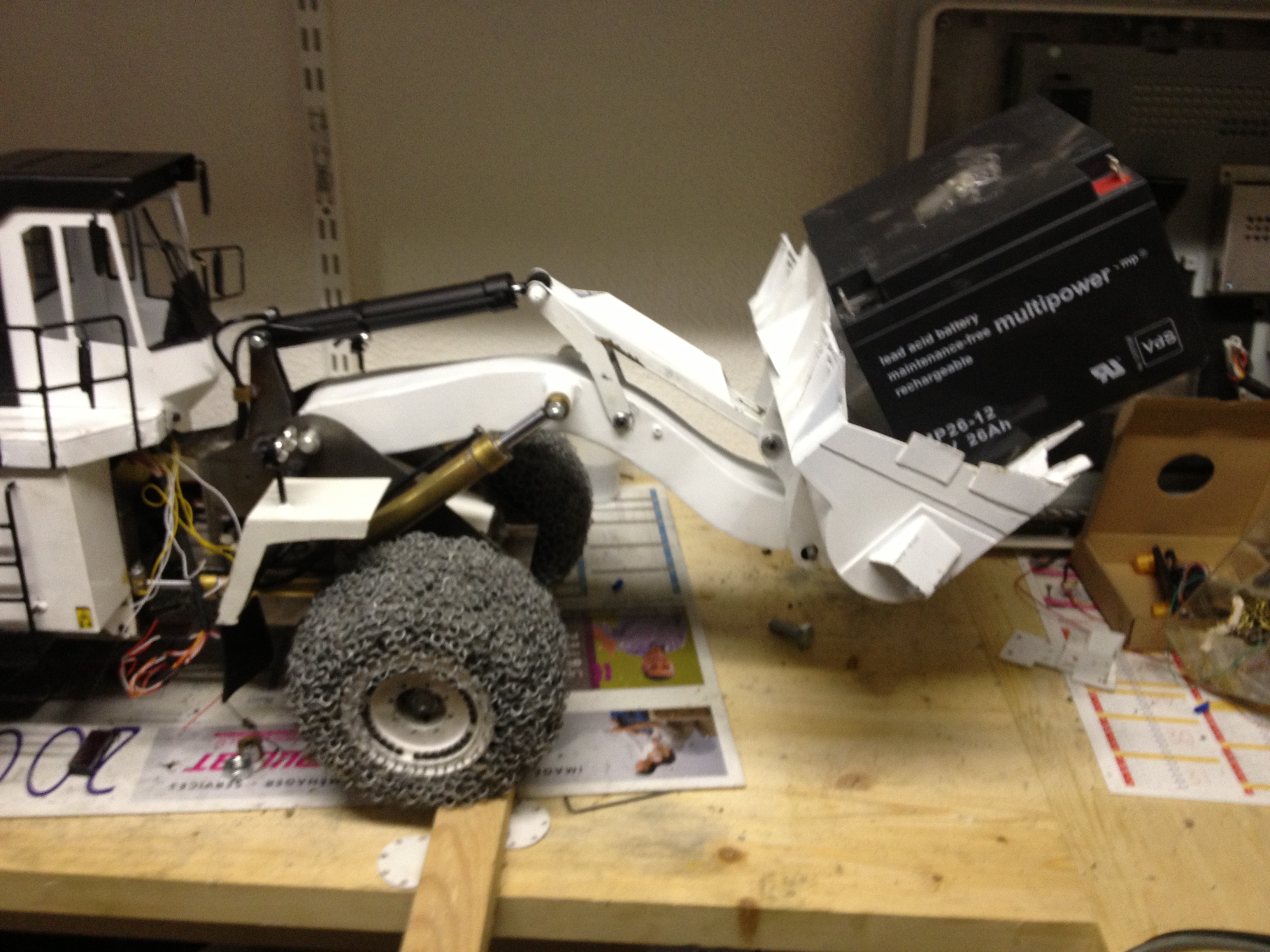 dans le godet une petite batterie de 12volts 26 Ampère de 9kilogramme a 20 bars pas de soucis je lèves le tout bon sans la carrosserie je lève le cul